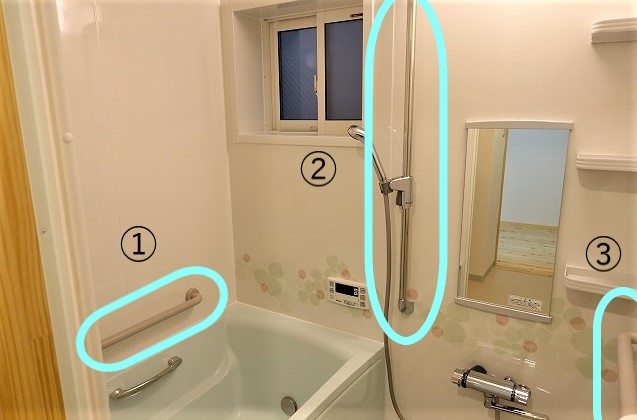 ②シャワーフック:手すりにもなる強度の強いフックを付けると、